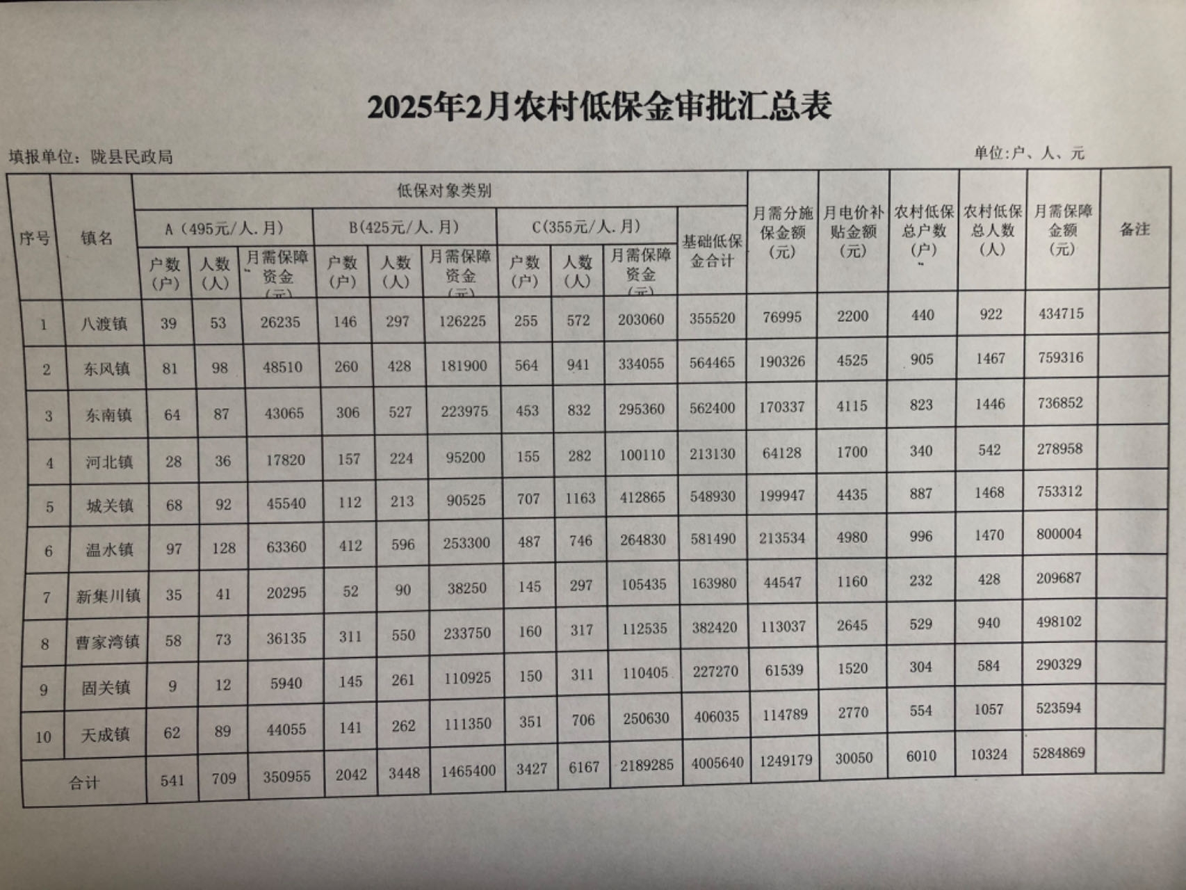 2025年2月农村低保金审批汇总表