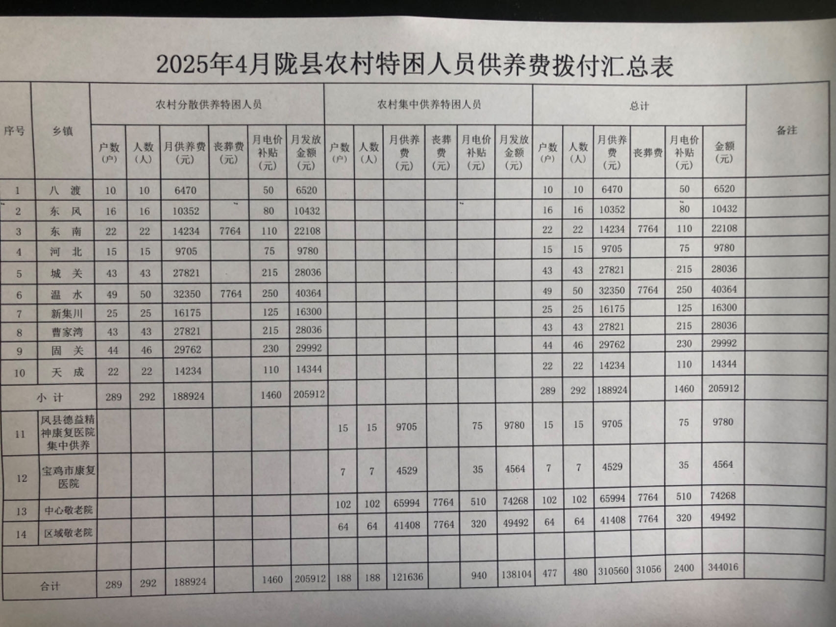 2025年4月陇县农村特困人员供养费拨付汇总表