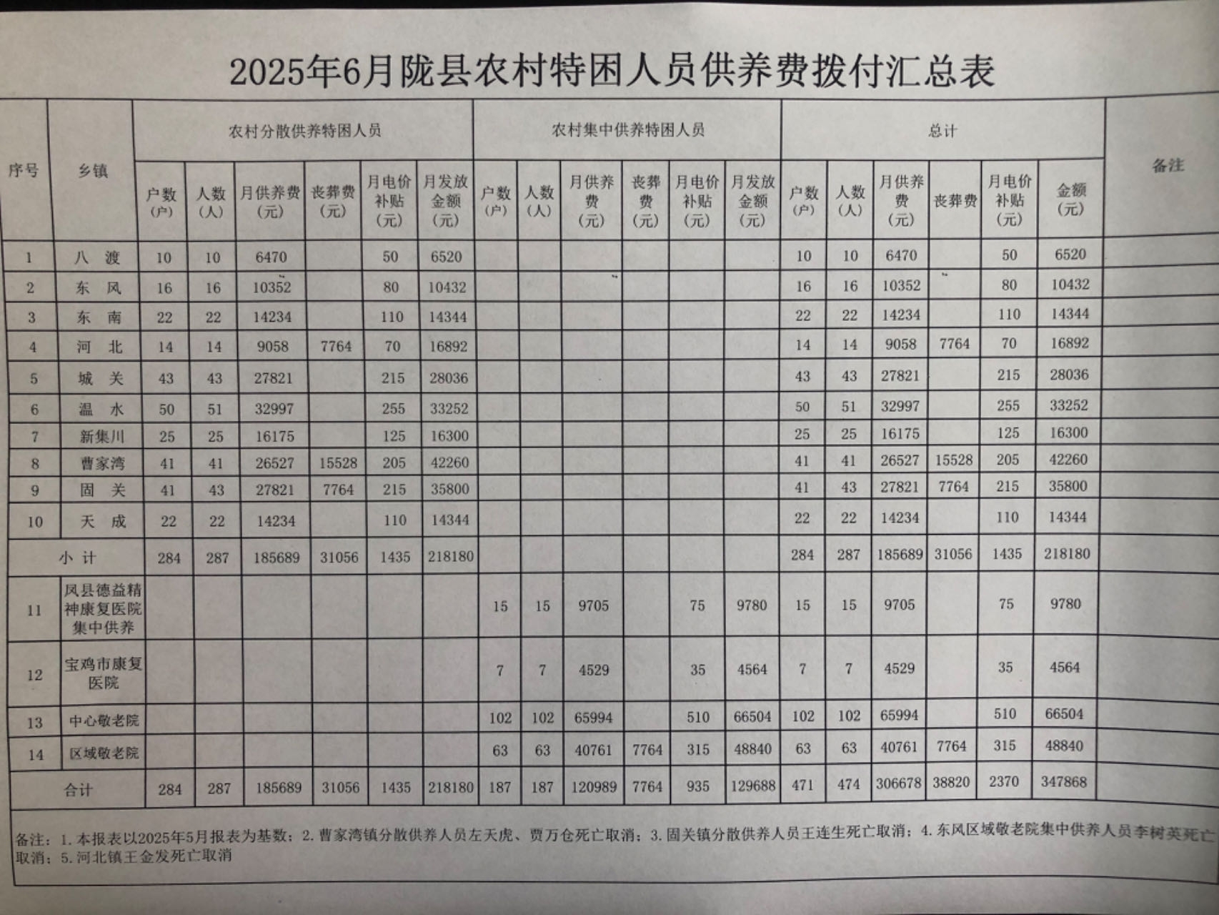 2025年6月陇县农村特困人员供养费拨付汇总表
