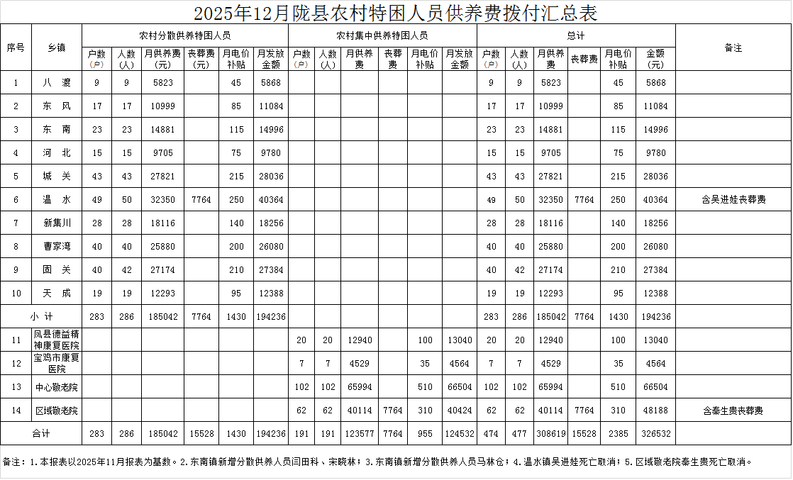 2025年12月陇县农村特困人员供养费拨付汇总表