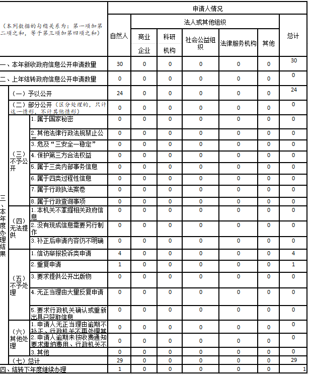 全县共受理政府信息公开申请30件,其中网上申请25件,邮寄申请5件,结转下年度1件;因政府信息公开引起的行政复议2件,行政诉讼2件。