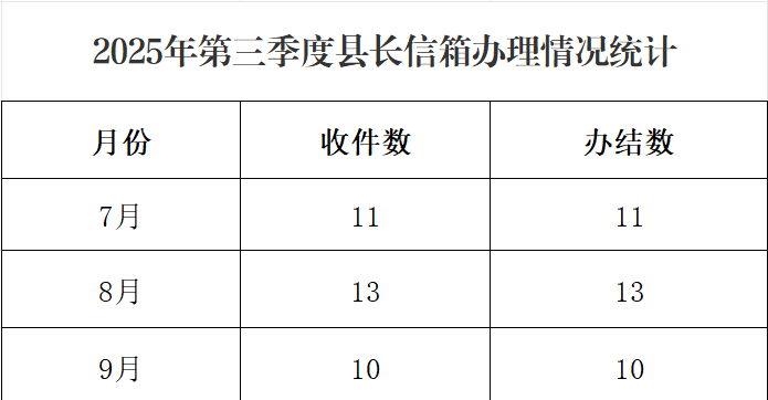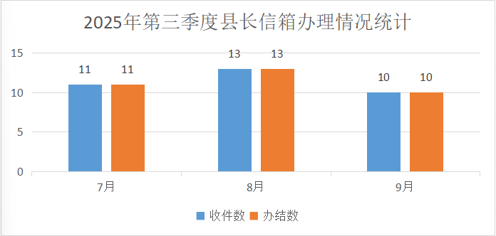 2025年第三季度,陇县县长信箱共收到信件34件,办结34件,详细统计如下: