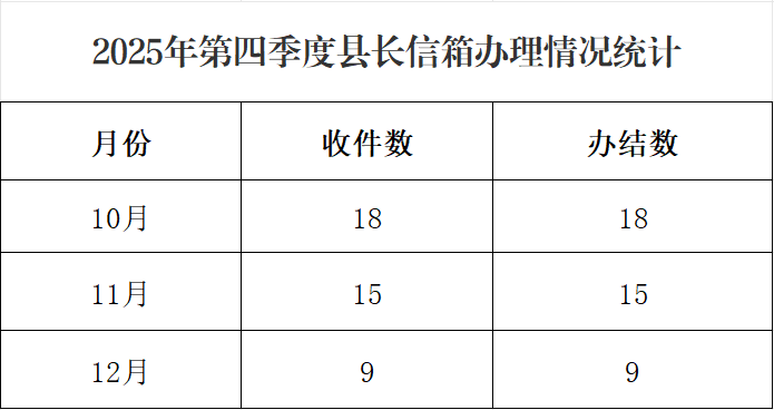 2025年第四季度,陇县县长信箱共收到信件42件,办结42件,详细统计如下: